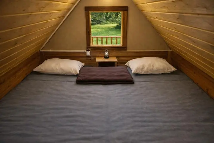 Die Sky Lodges stehen auf einer erhöhten Holzplattform und sind über eine Treppe erreichbar. Der Schlafbereich befindet sich oben und ist auf das Wesentliche ausgerichtet: gemütlich, geschützt und angenehm hell. Unten gibt es einen überdachten Sitzbereich mit Tisch und Bank. Diese wettergeschützte Sitzmöglichkeit ist besonders praktisch – für den Morgenkaffee, eine Pause zwischendurch oder den entspannten Tagesausklang, auch wenn das Wetter mal nicht ganz mitspielt.