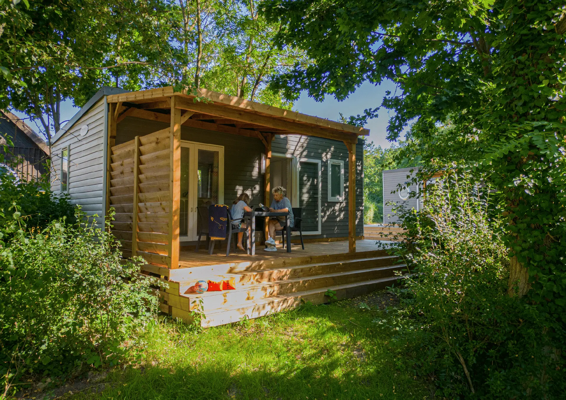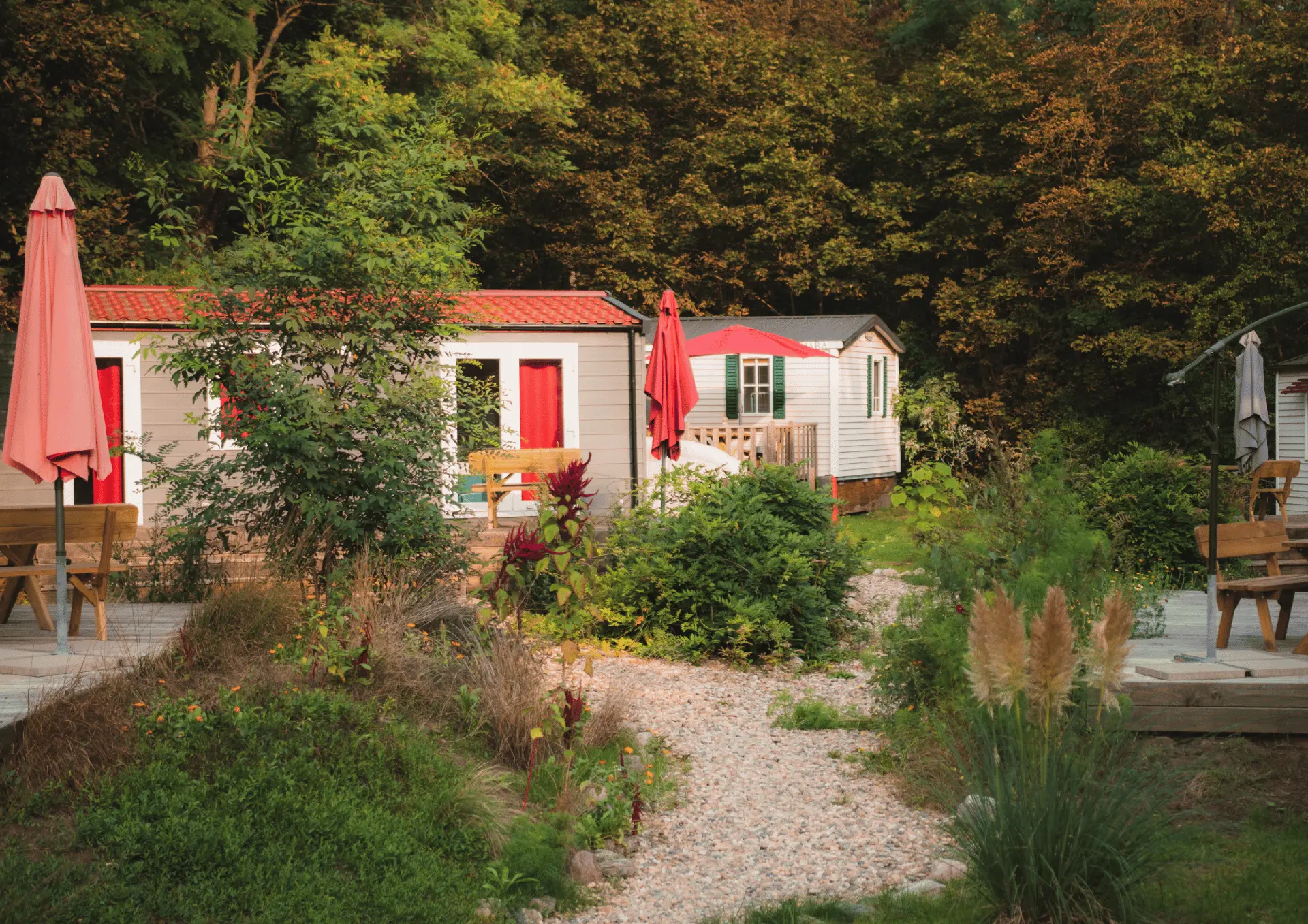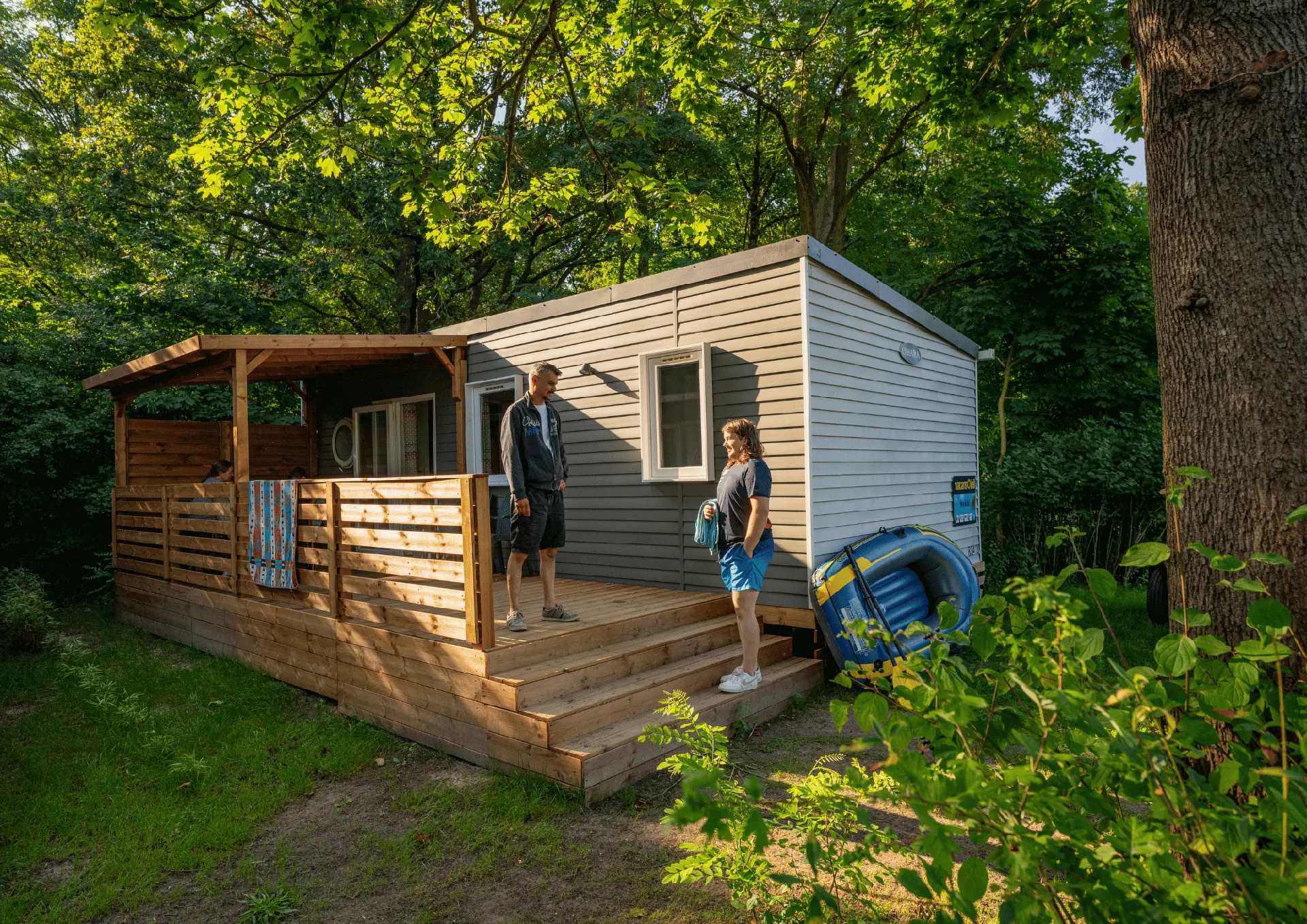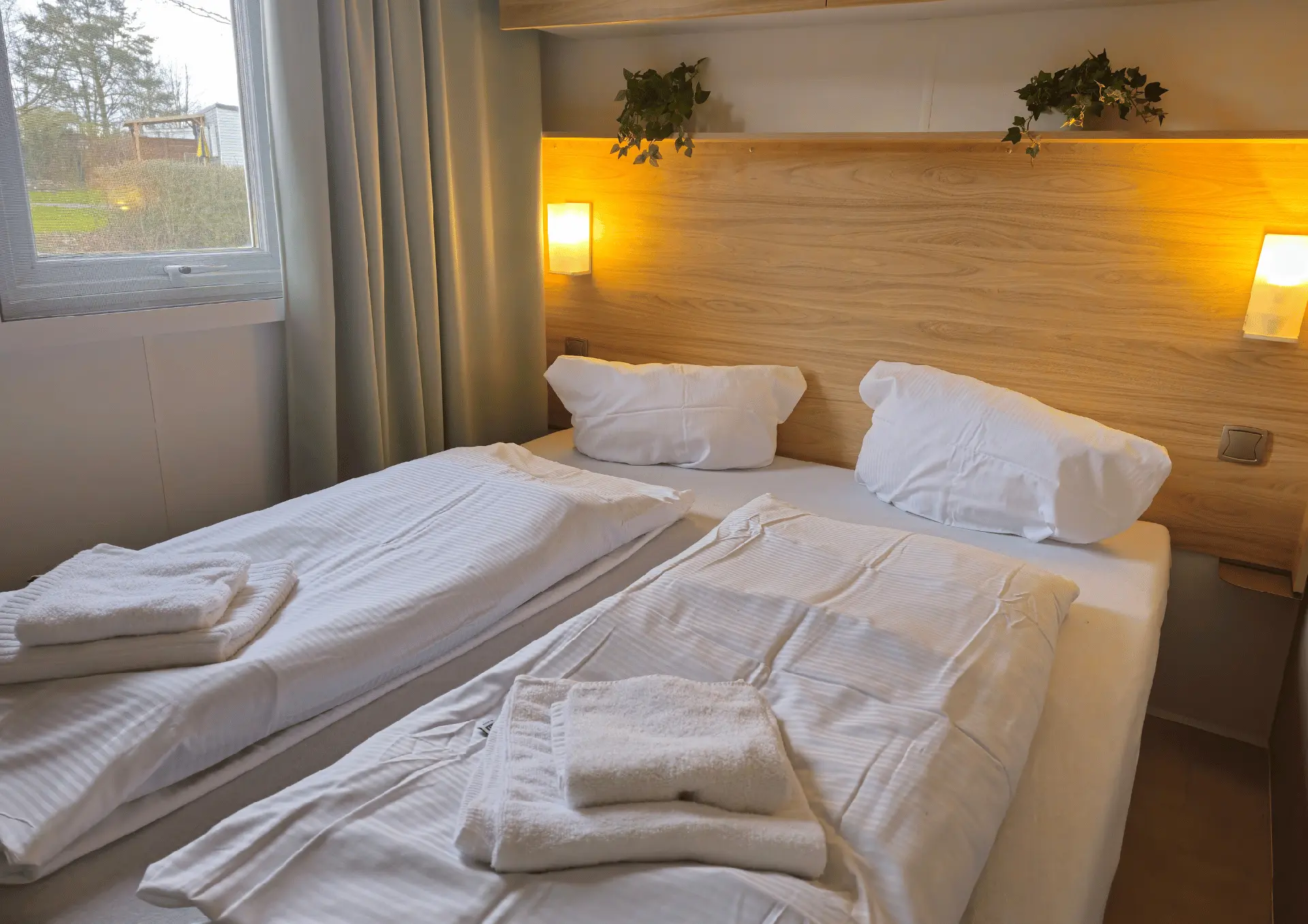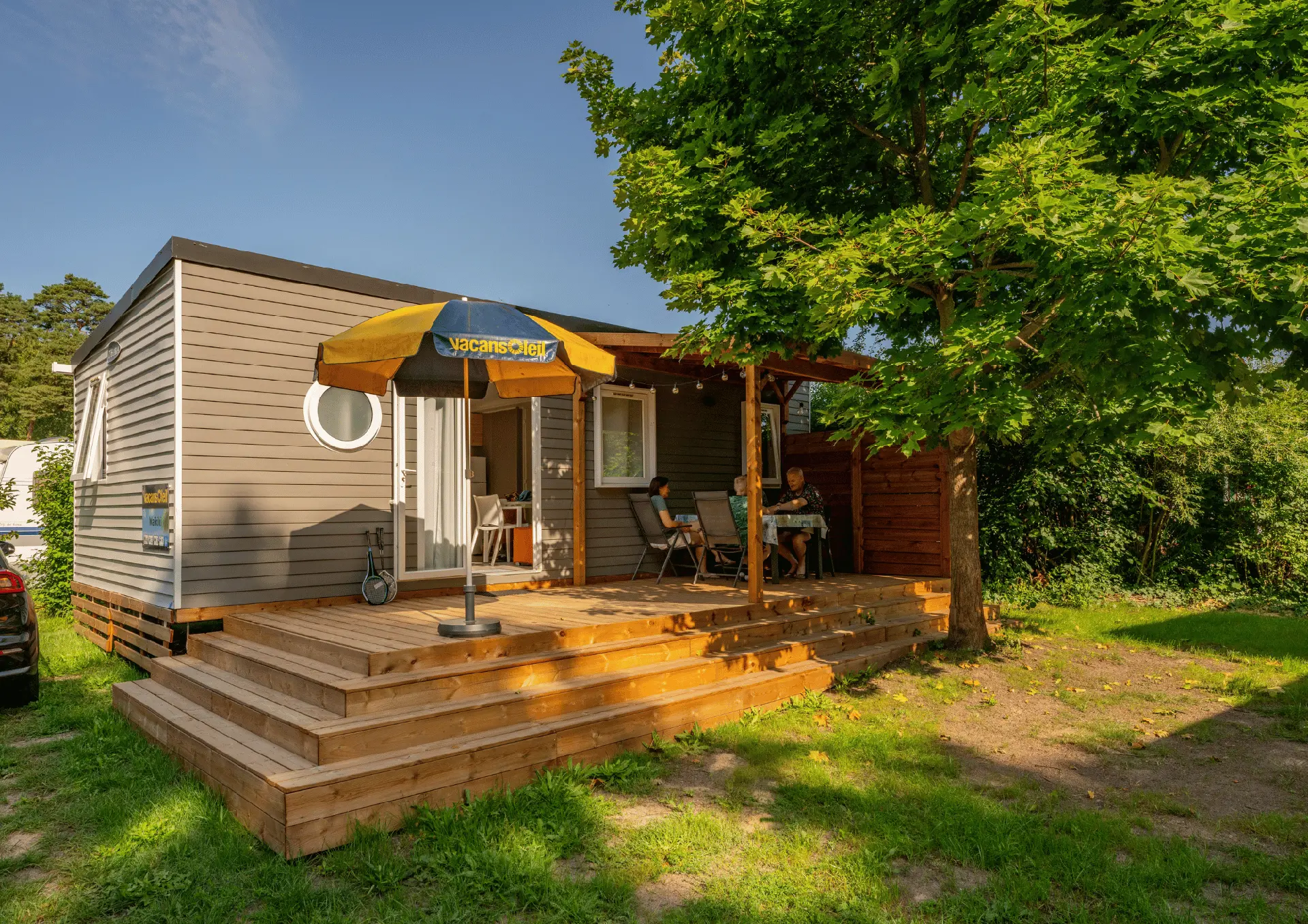 Unsere Comfort-Mobilheime vereinen auf 40 m² Gemütlichkeit und Komfort – nur wenige Gehminuten vom See entfernt.