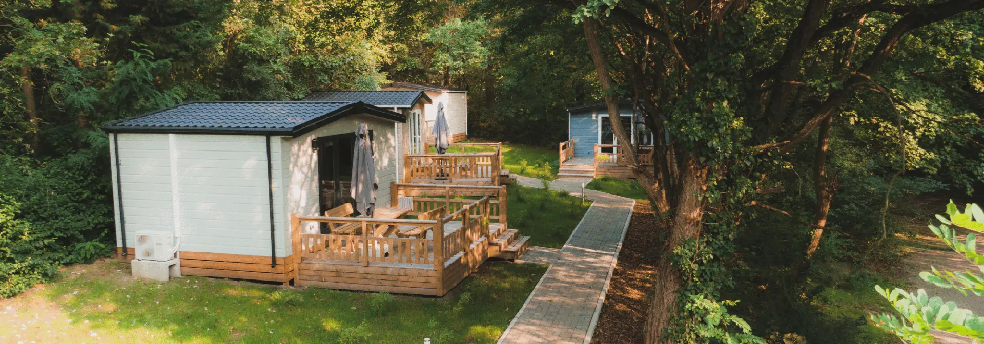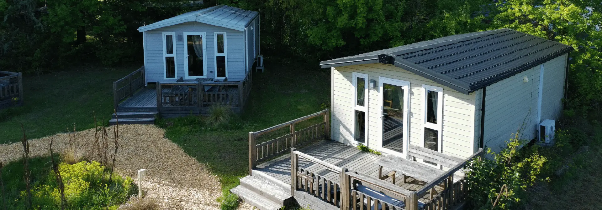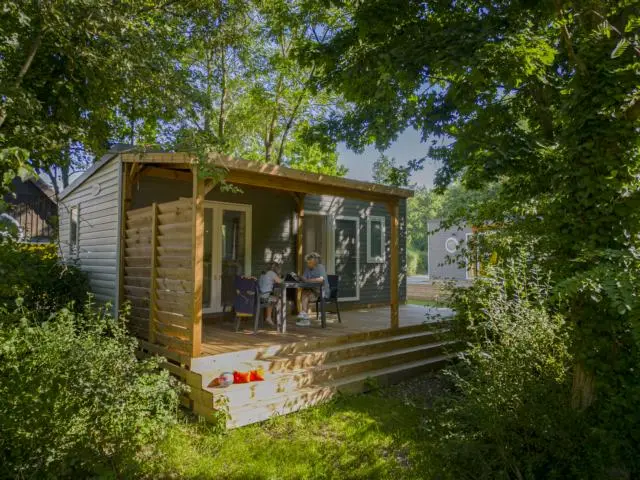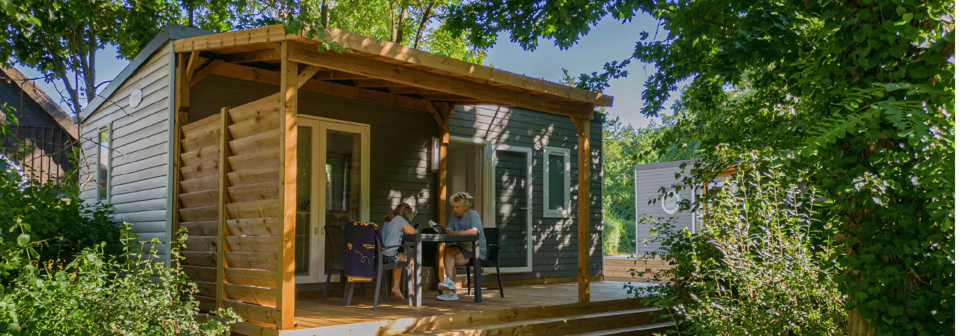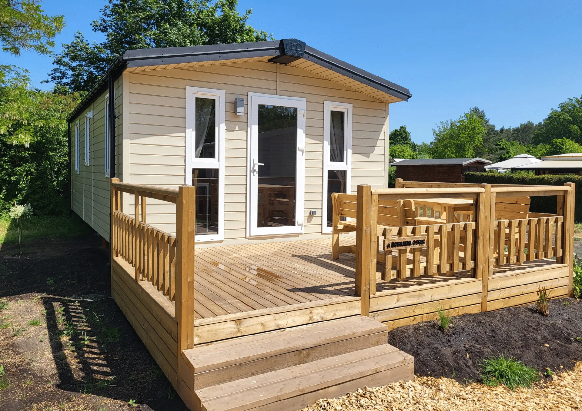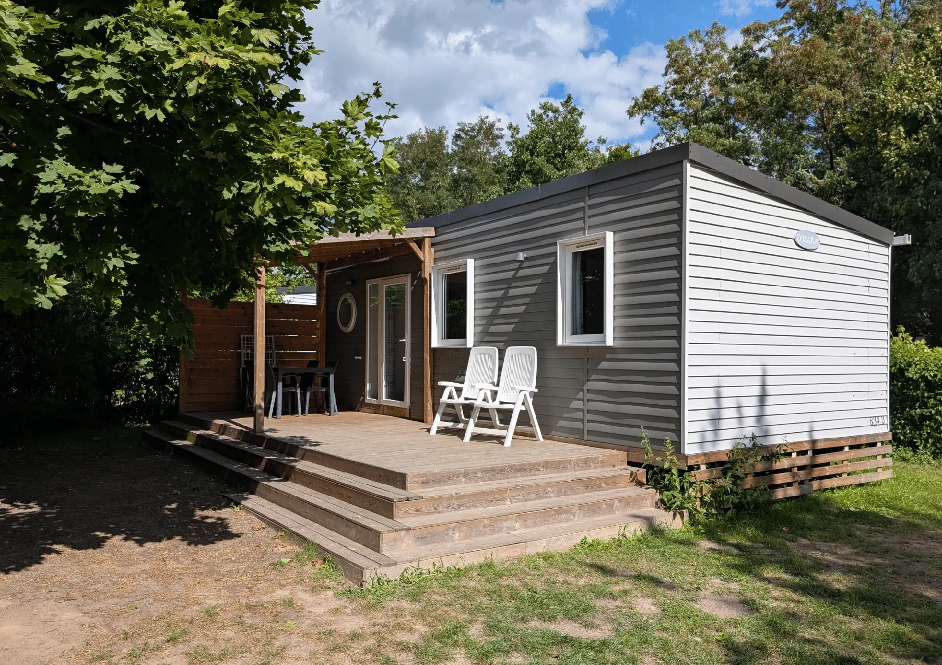 Unsere Comfort-Mobilheime vereinen auf 40 m² Gemütlichkeit und Komfort – nur wenige Gehminuten vom See entfernt.