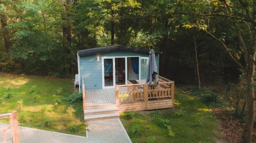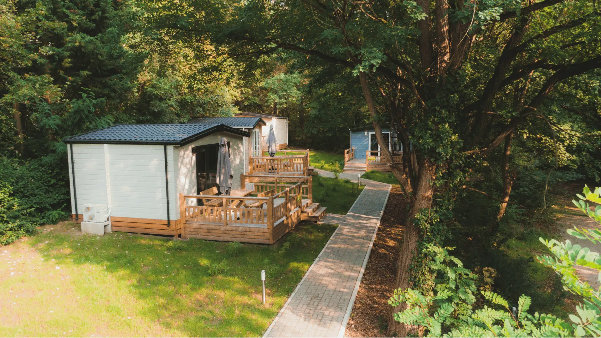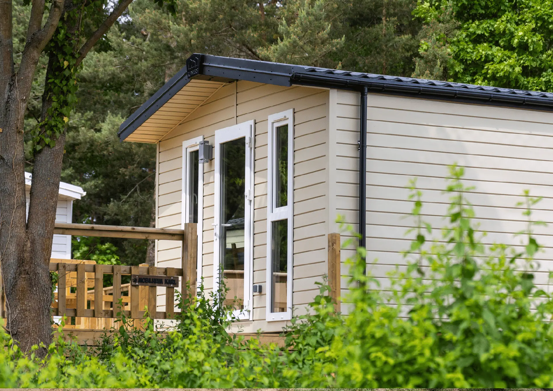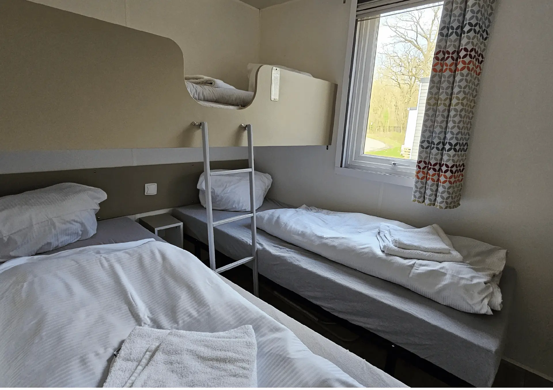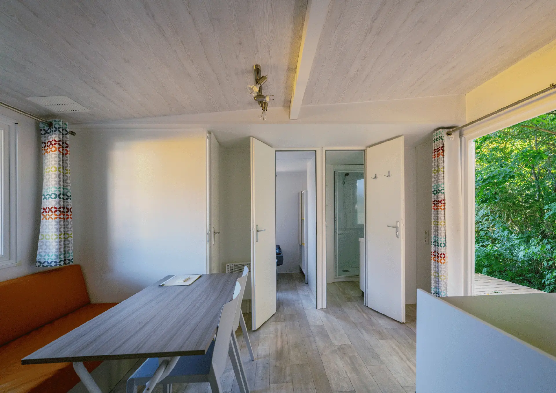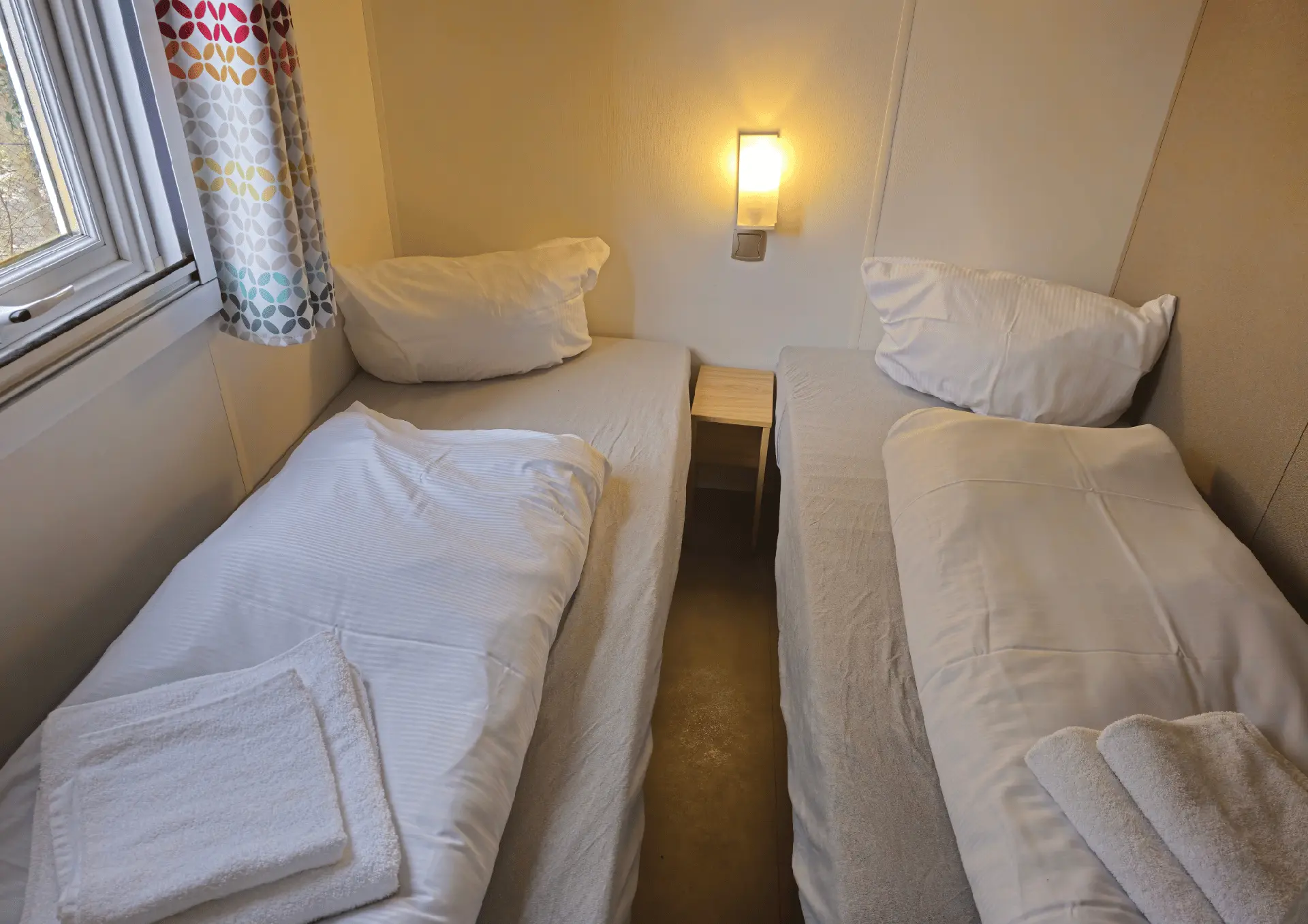 Unsere Comfort-Mobilheime vereinen auf 40 m² Gemütlichkeit und Komfort – nur wenige Gehminuten vom See entfernt.