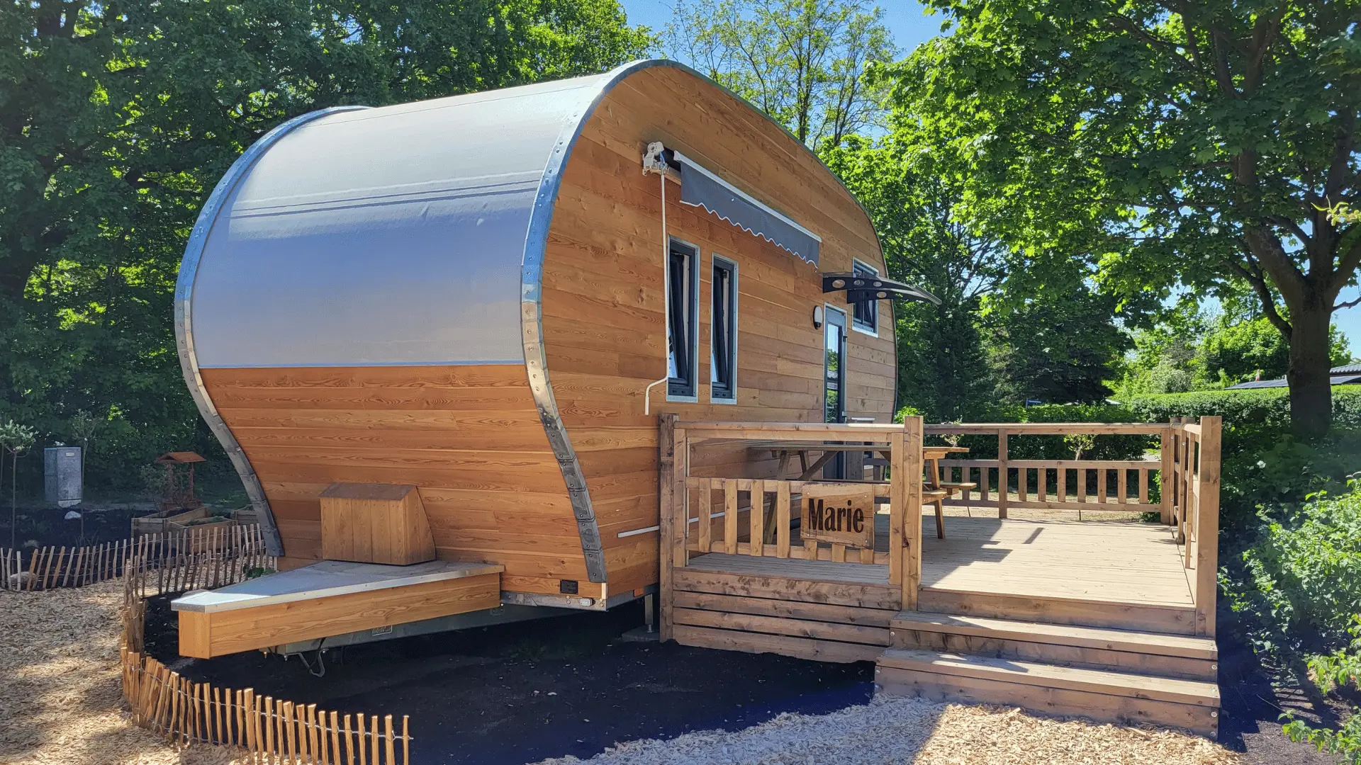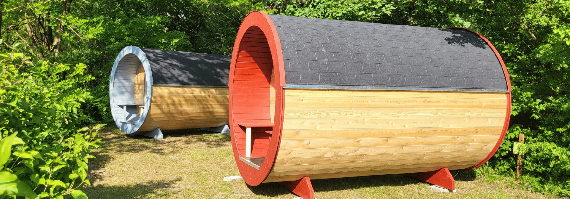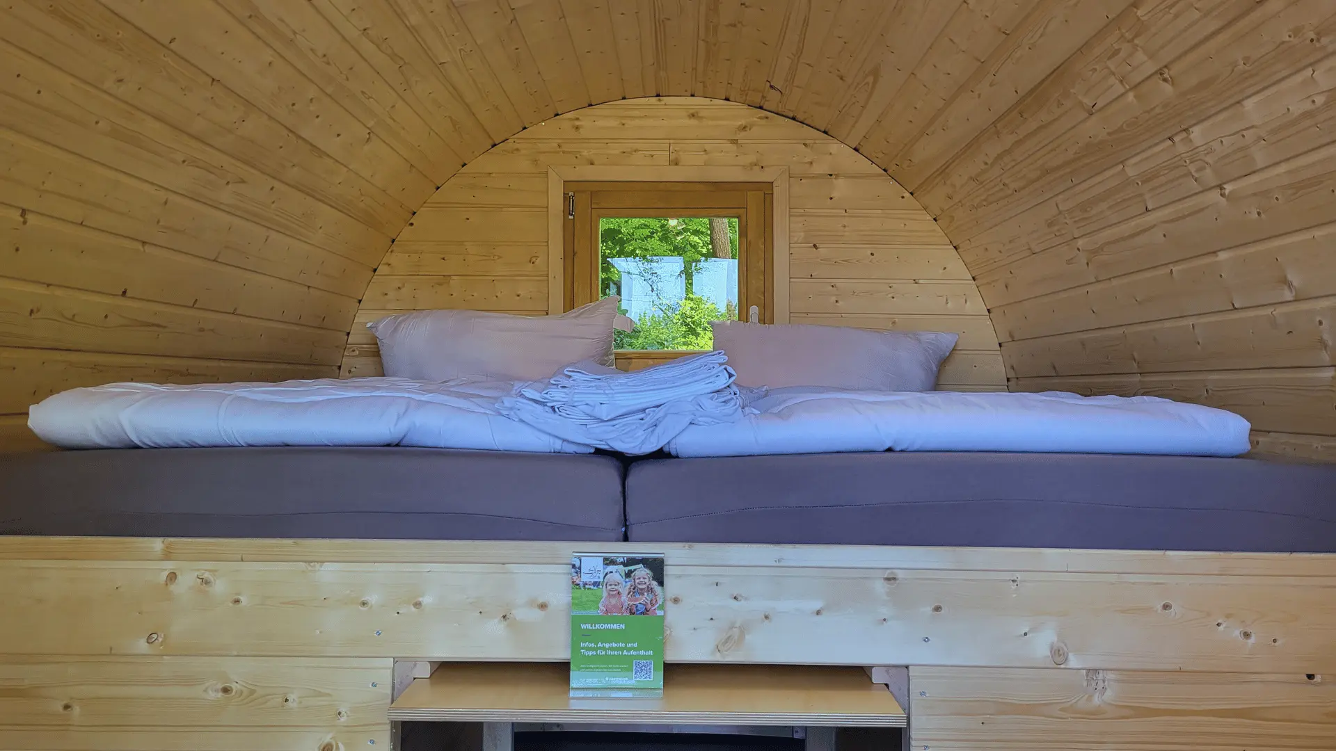 Unsere Campingfässer sind für 2 Personen ausgelegt. Im hinteren Bereich gibt es ein breites Doppelbett und eine gemütliche Sitzecke im vorderen Bereich.