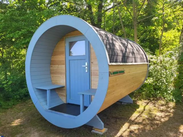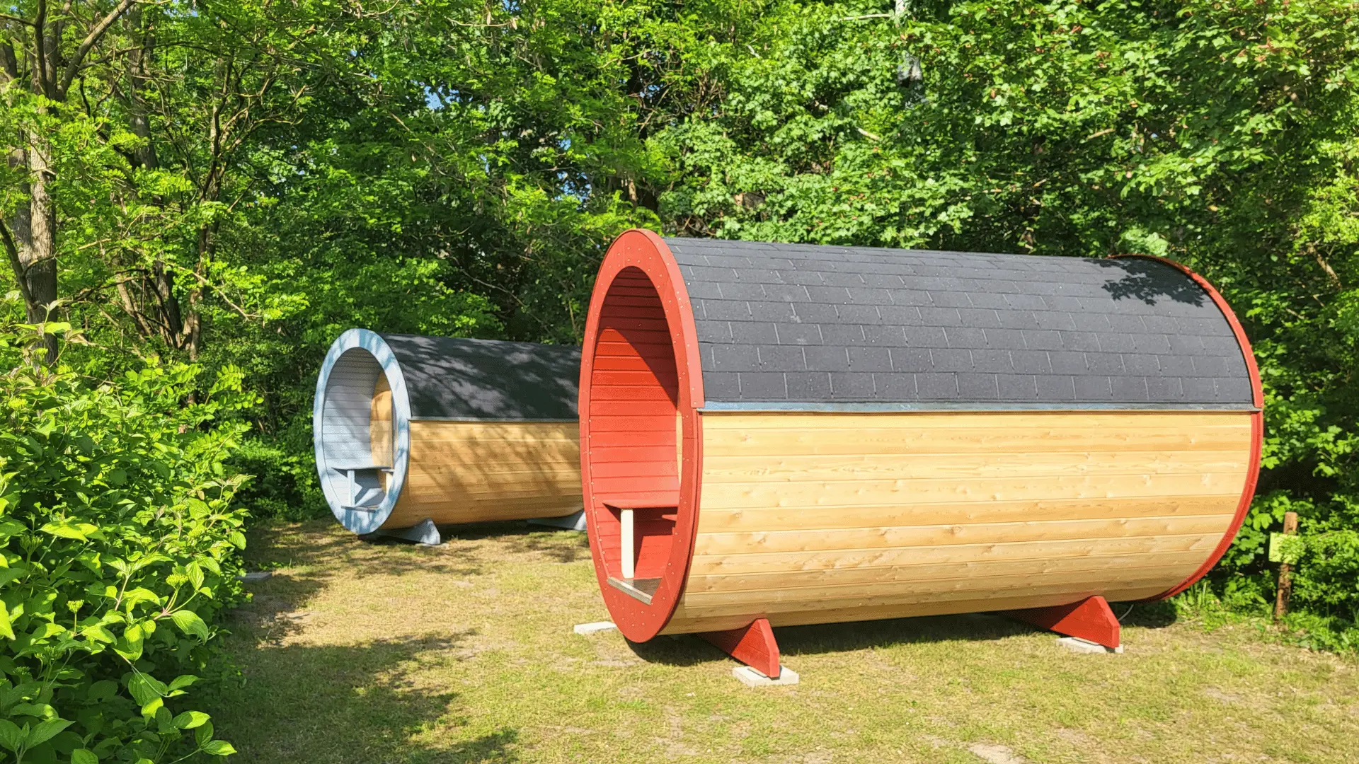 In unmittelbarer Nähe der Campingfässer ist ein Sanitärgebäude, Spülküche und die Freizeiteinrichtungen.
