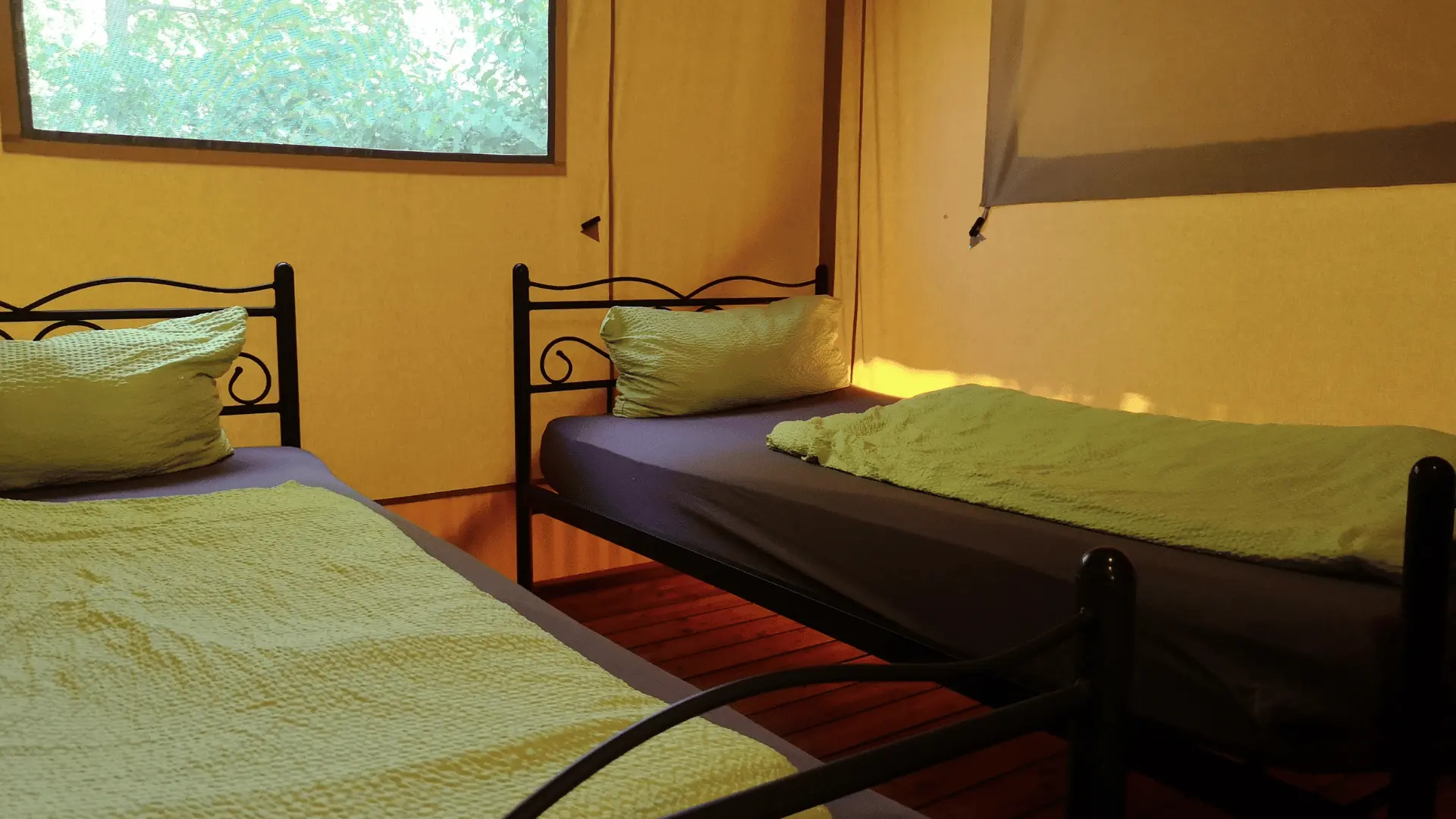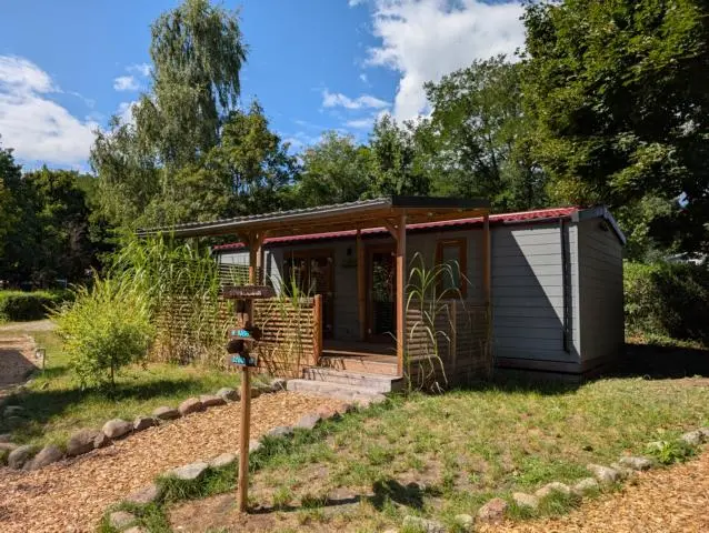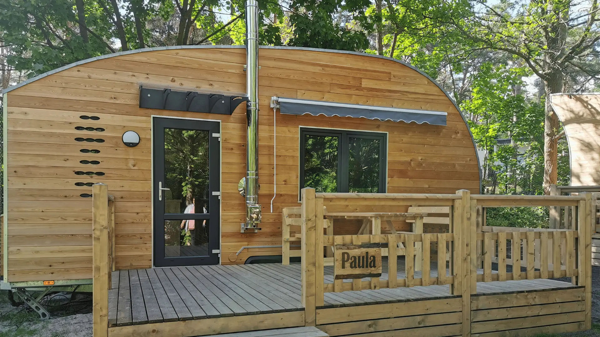 ✔️ 8 m2 Wohnfläche ✔️ Sitzmöglichkeit im überdachten Außenbereich ✔️ 1x Doppelbett ✔️ Gemeinschaftsbad im direkt daneben liegenden Sanitärgebäude ✔️ Handtücher auf Anfrage