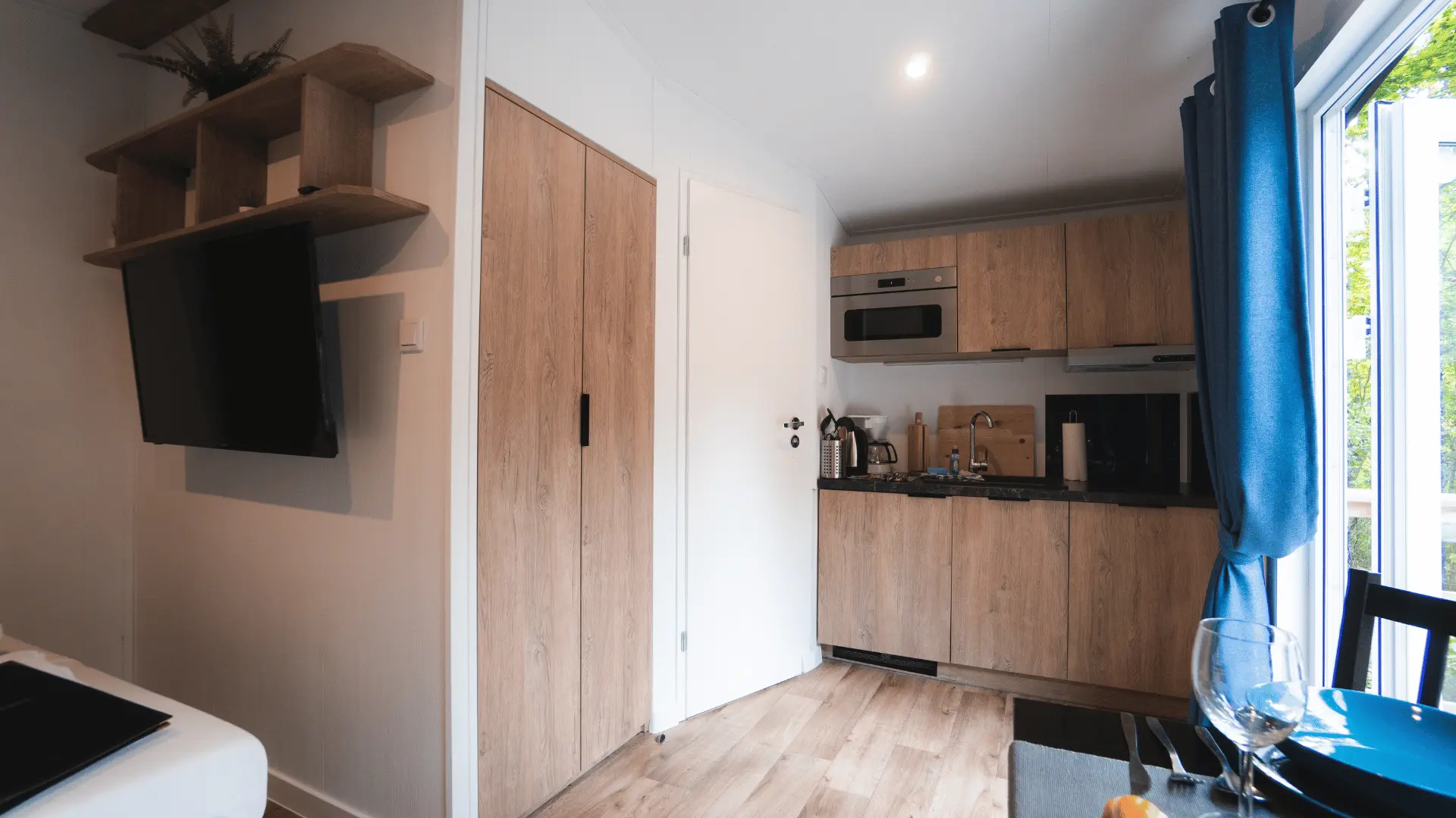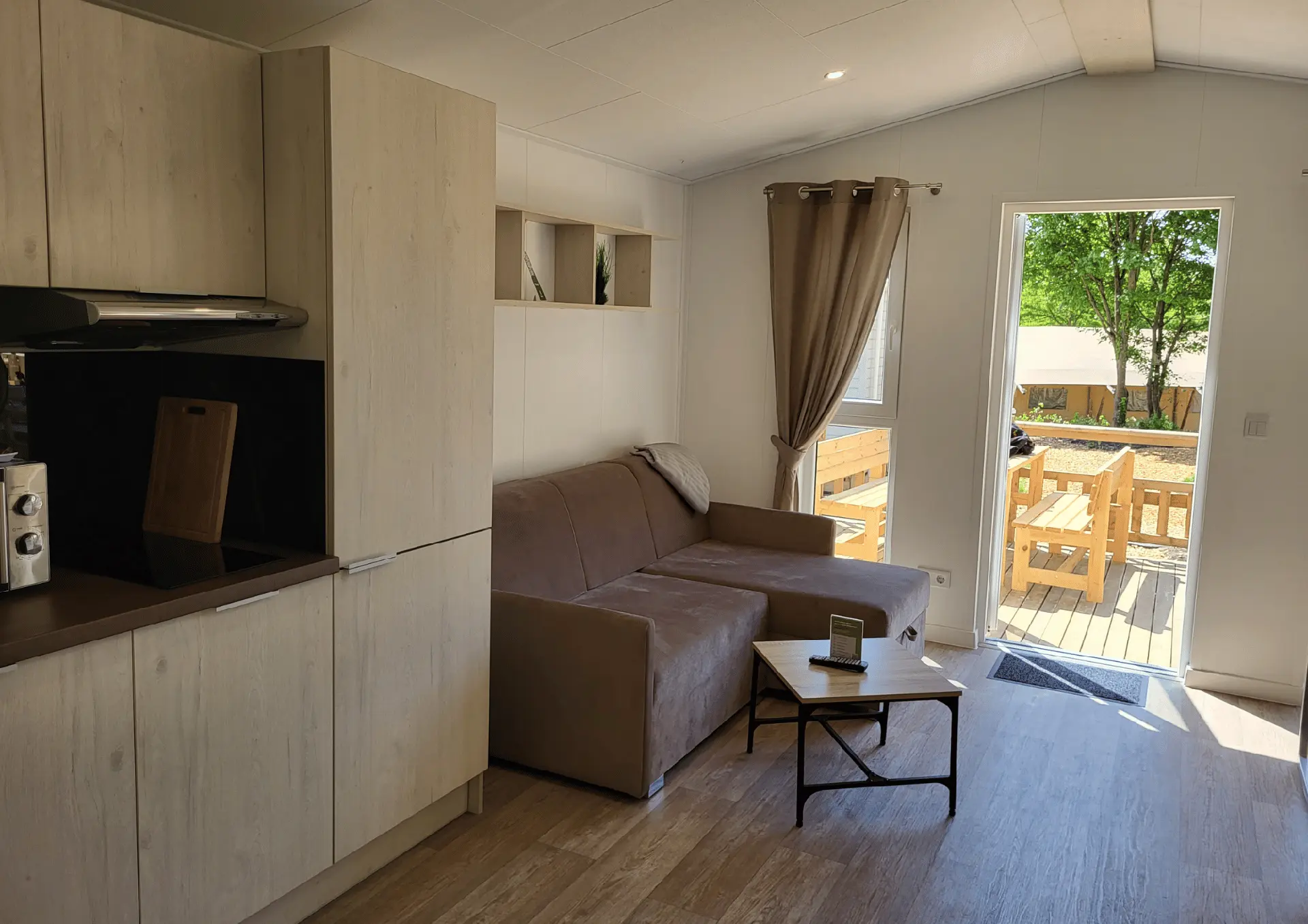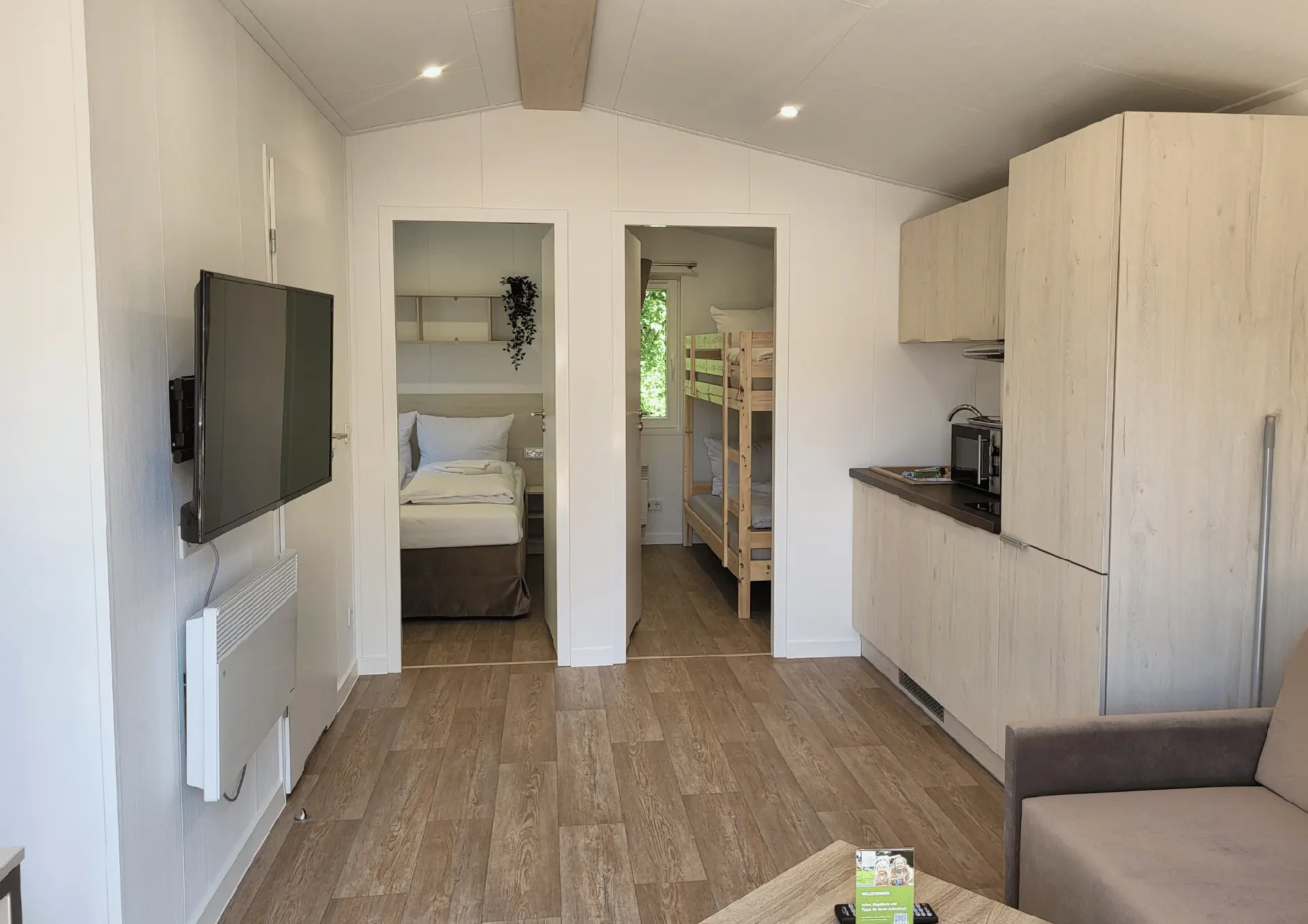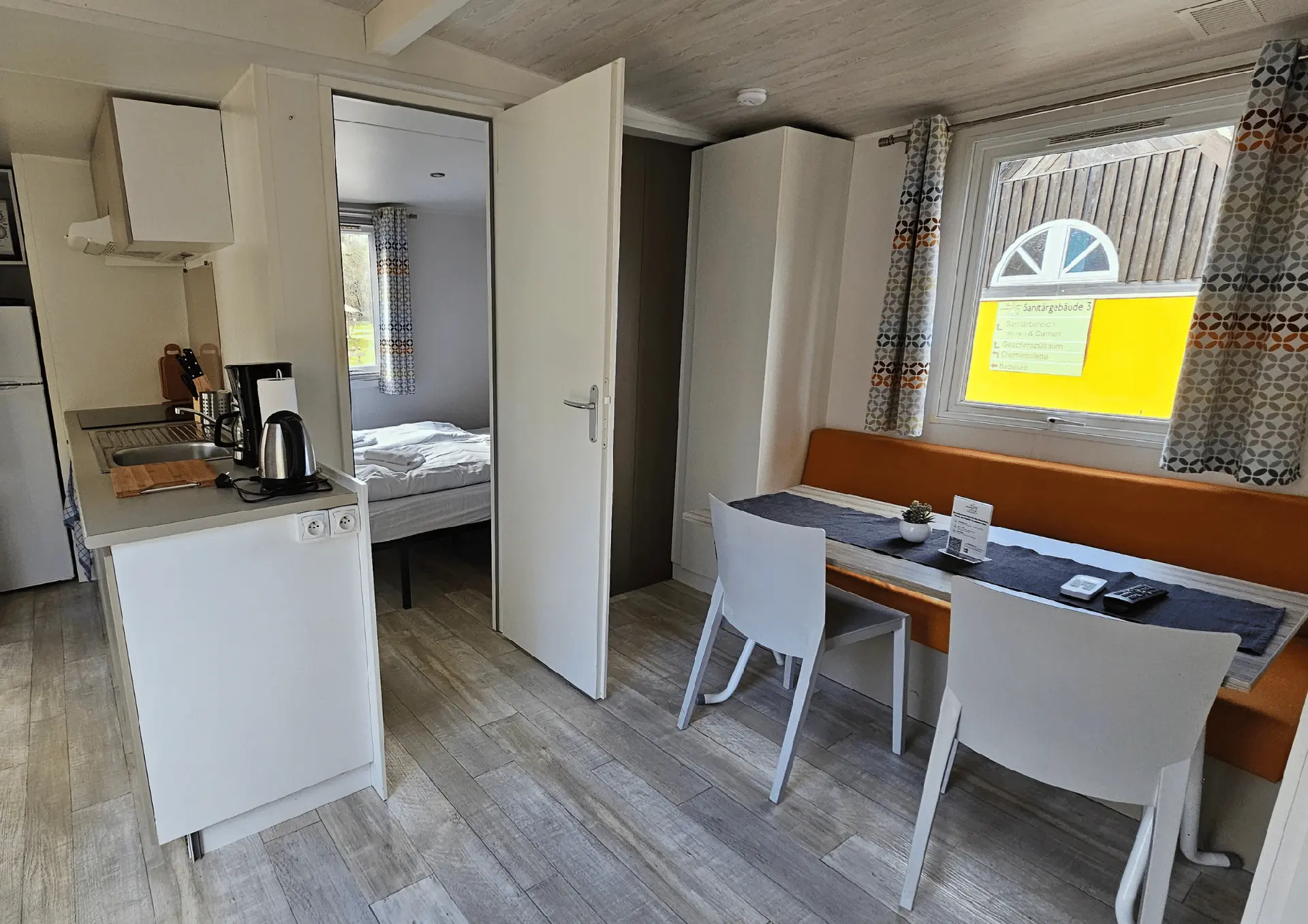Unser Mobilheim Comfort der Kategorie 2 bietet auf 27 m² durchdachten Wohnkomfort für bis zu 4 Personen. Der offene Wohnbereich verfügt über eine gemütliche Sitzecke mit Sofa und TV sowie eine integrierte, voll ausgestattete Küche. Das moderne Badezimmer ist mit Dusche, Waschbecken und WC ausgestattet.