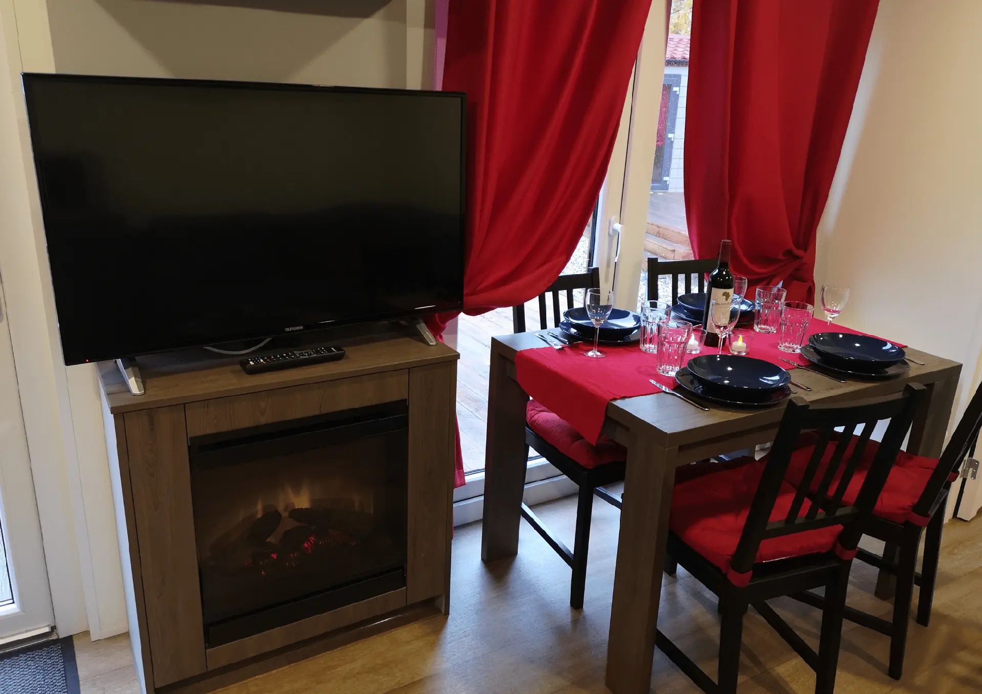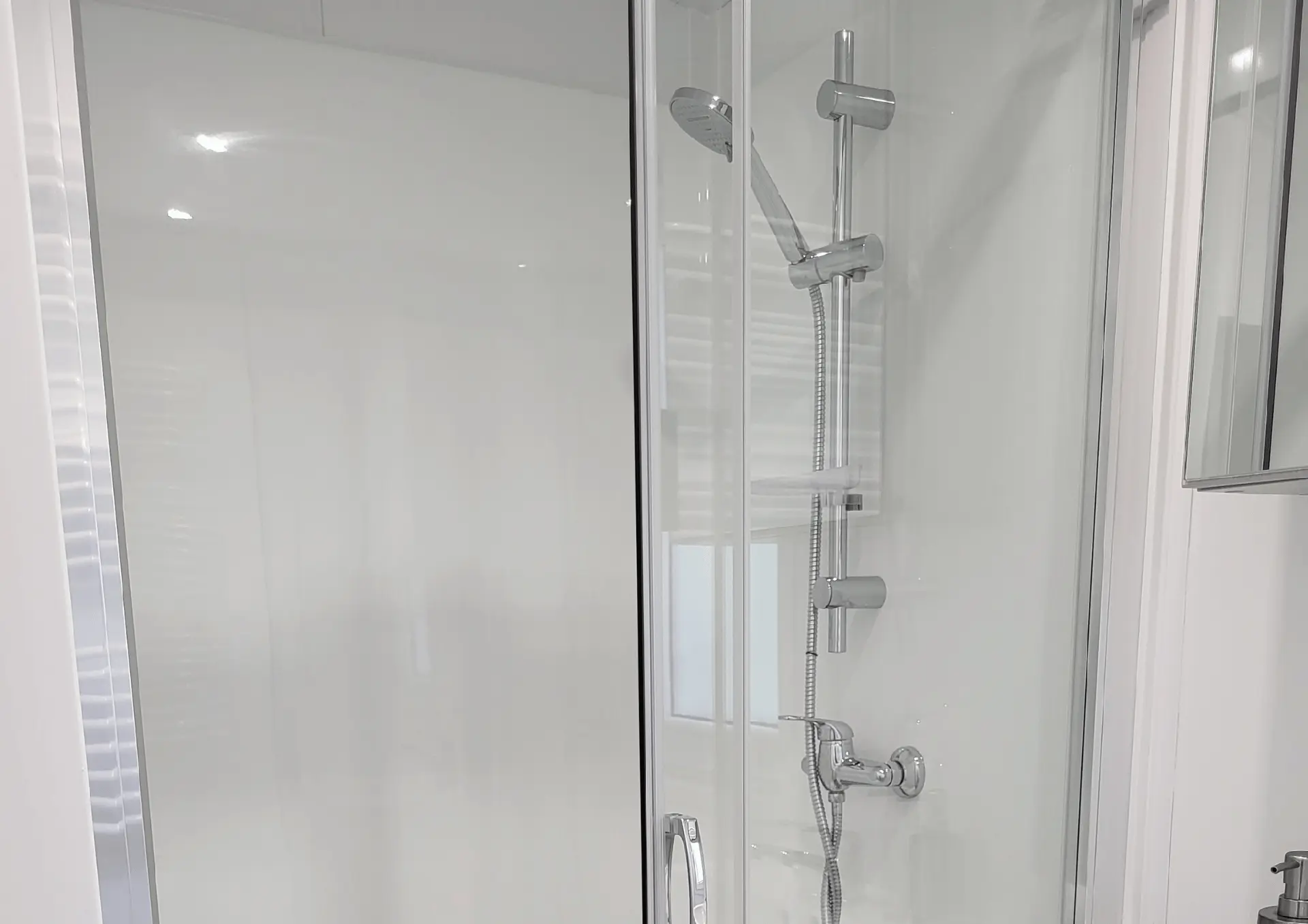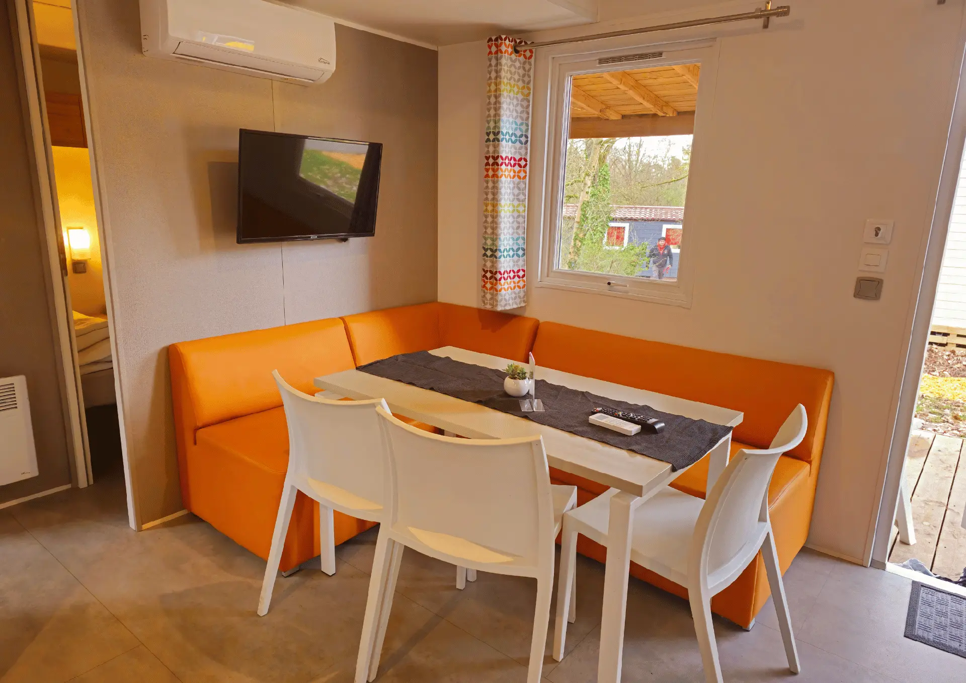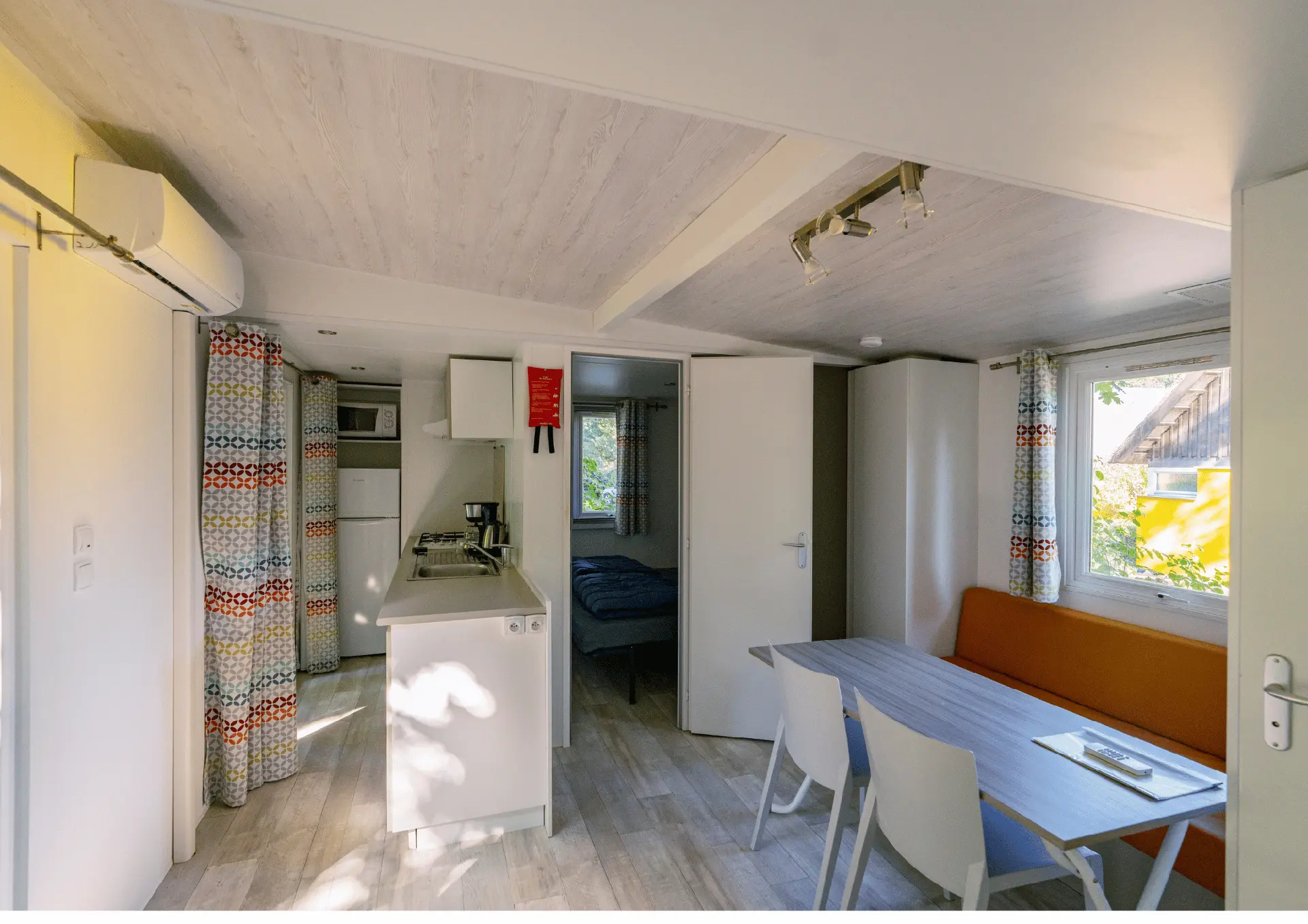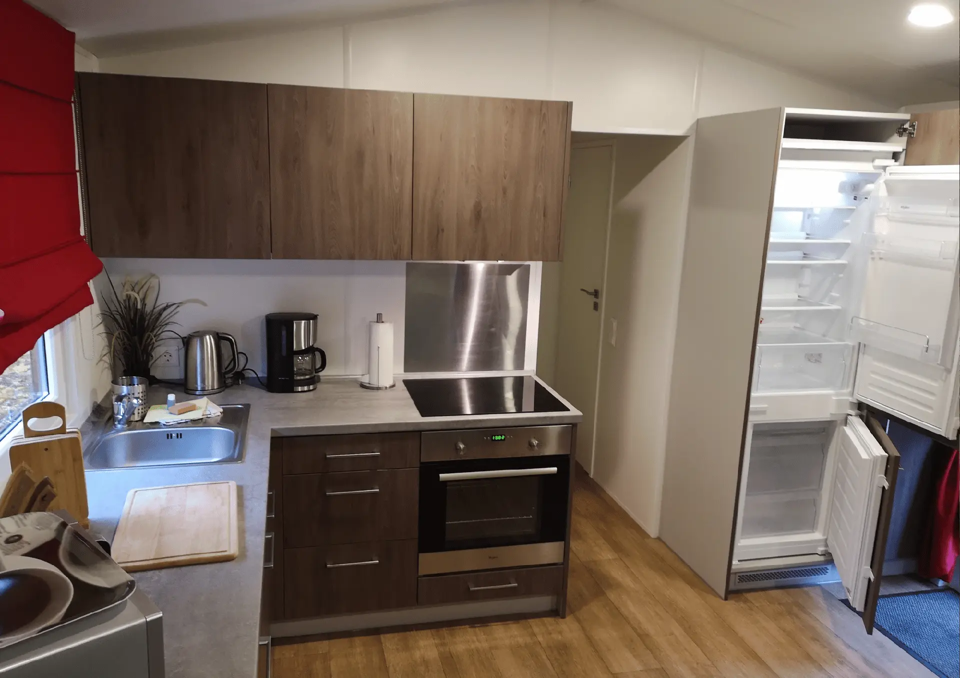 Unser Mobilheim Comfort der Kategorie 2 bietet auf 27 m² durchdachten Wohnkomfort für bis zu 4 Personen. Der offene Wohnbereich verfügt über eine gemütliche Sitzecke mit Sofa und TV sowie eine integrierte, voll ausgestattete Küche. Das moderne Badezimmer ist mit Dusche, Waschbecken und WC ausgestattet.