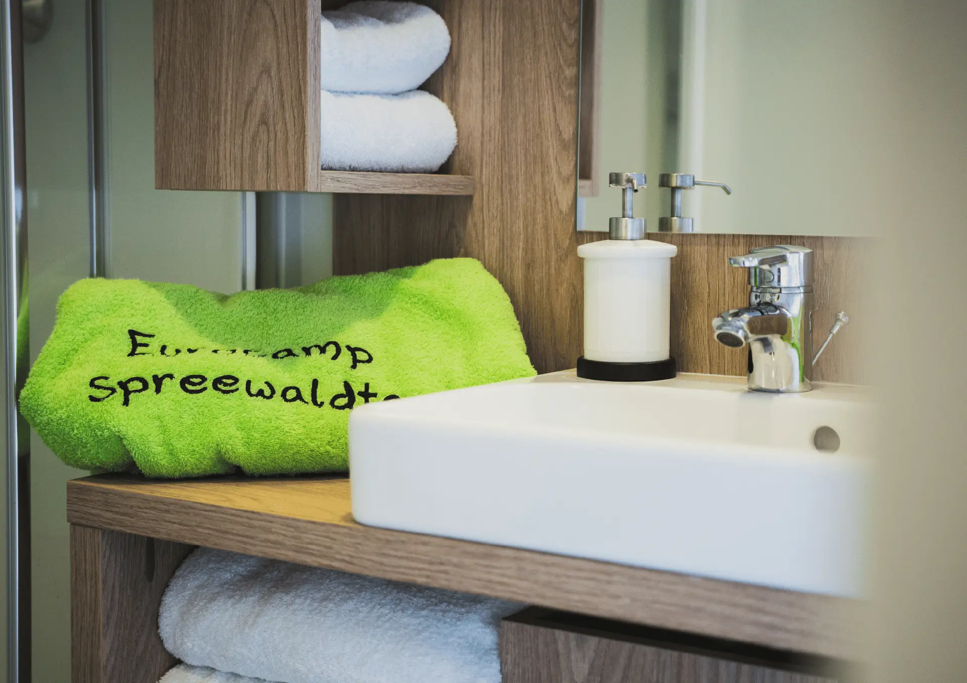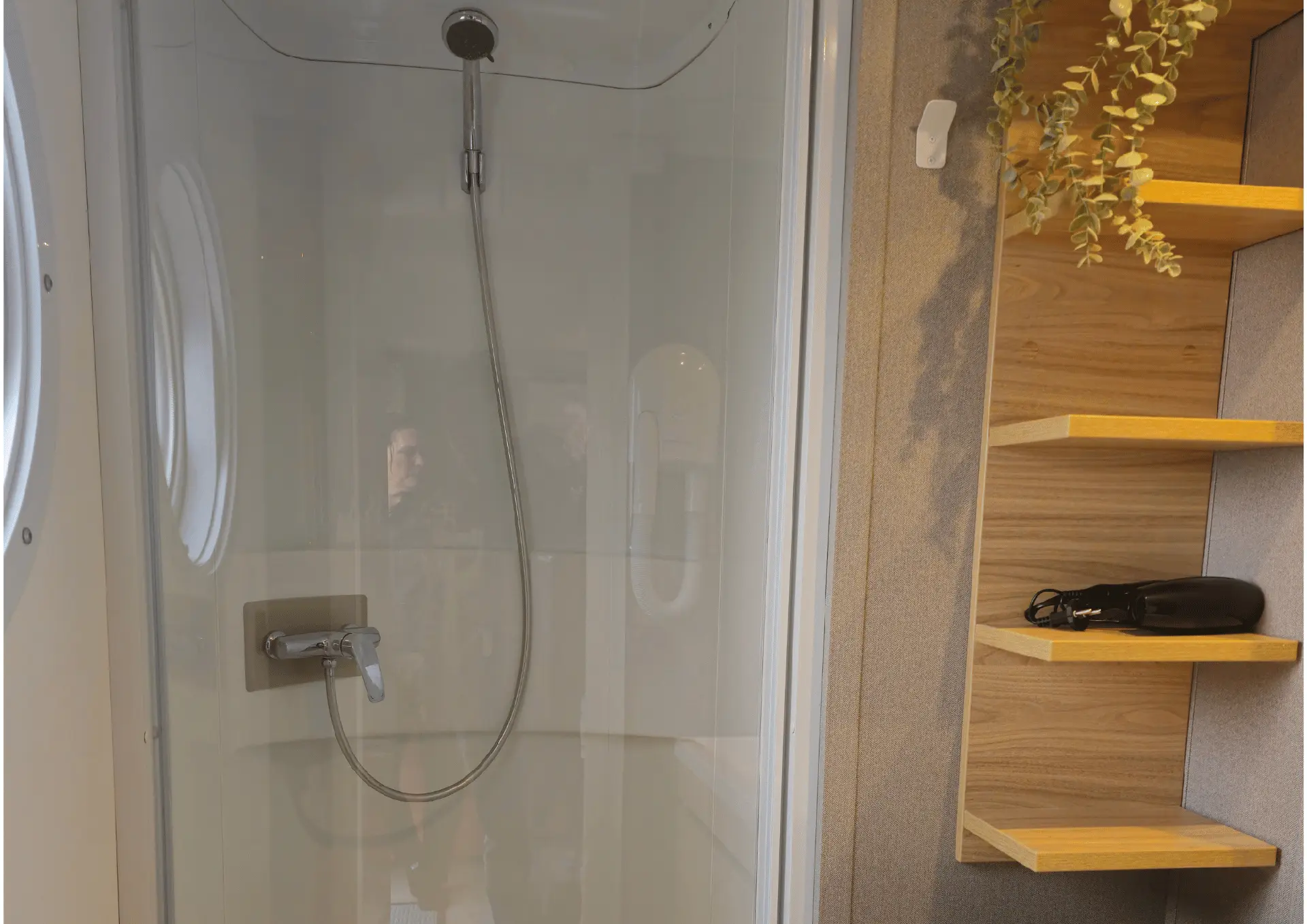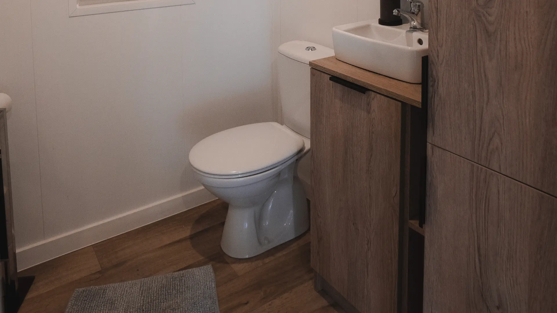 Ebenso gibt es im Tiny House ein komfortables Badezimmer, mit Komfortdusche, Toilette und Waschbecken.