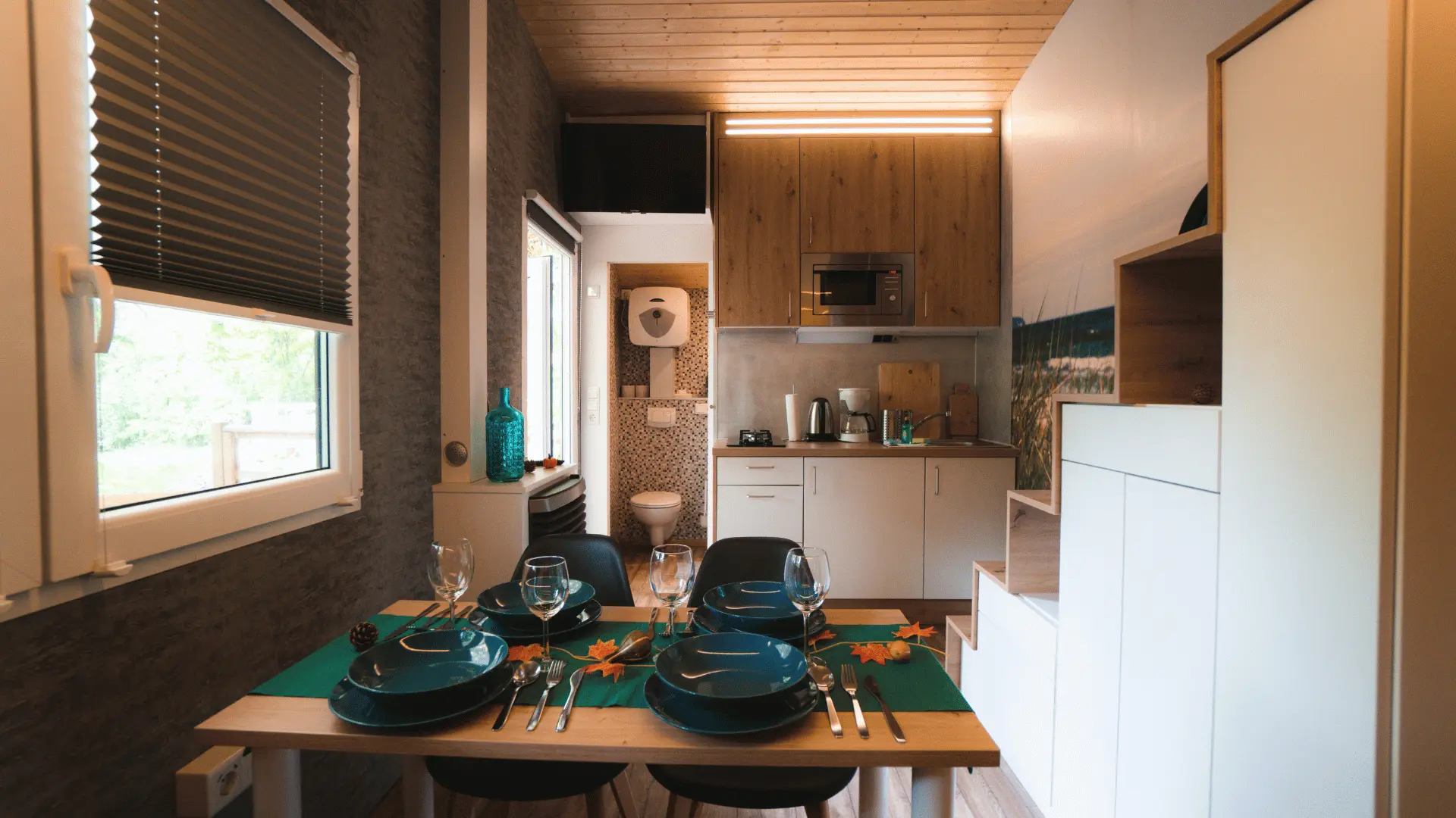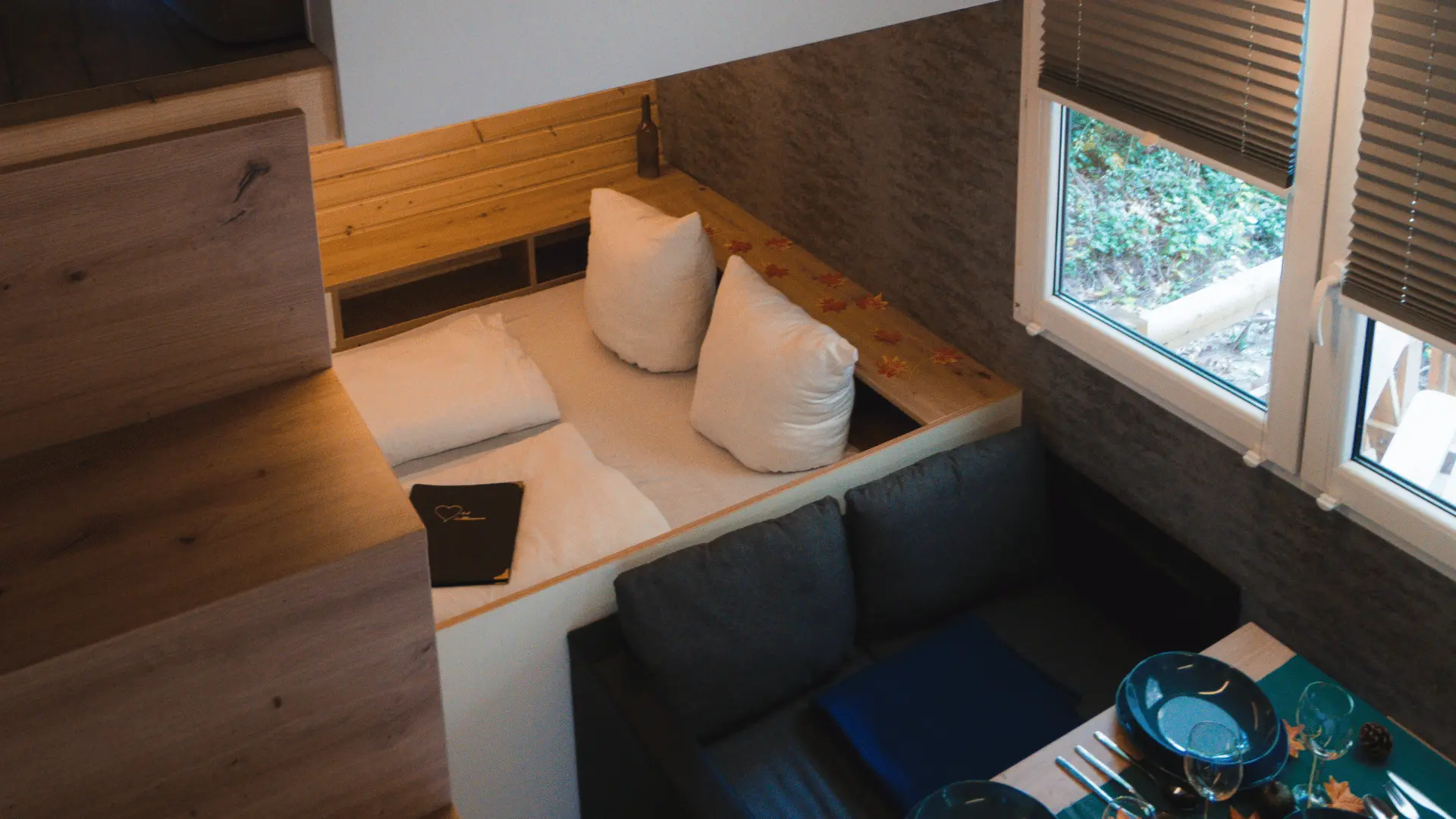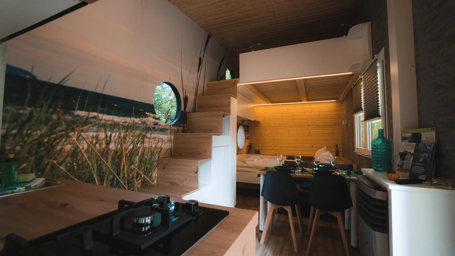 Unser Tiny House ist ein wahres Raumwunder auf 16 m² und bietet alles, was man im Urlaub braucht. Es verfügt über ein Doppelbett und zwei Einzelbetten auf unterschiedlichen Ebenen und bietet somit Platz für vier Personen.